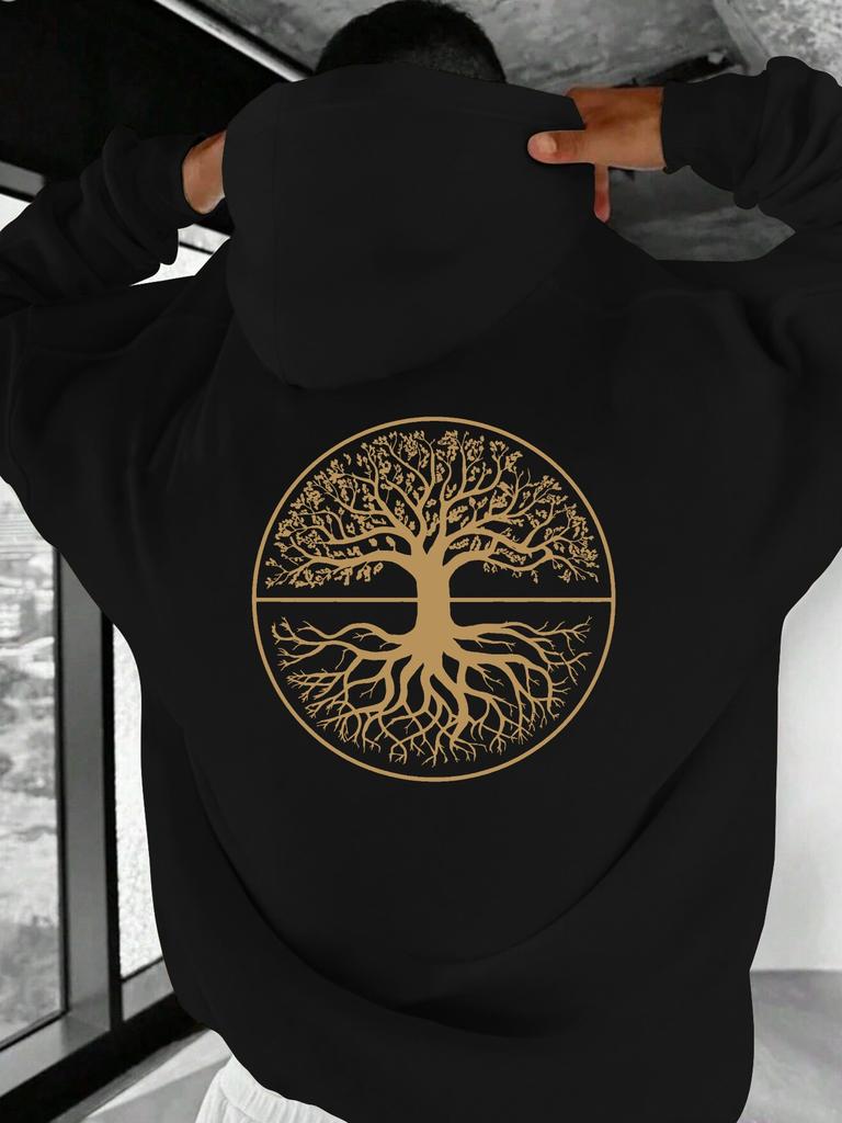 Мужское худи с графикой Дерево Жизни - Черный и золотой круглый принт, повседневный пуловер с передними карманами