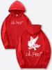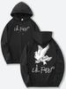 Men's black hooded sweatshirt with front and back prints and an adjustable drawstring hood, perfect for all seasons.