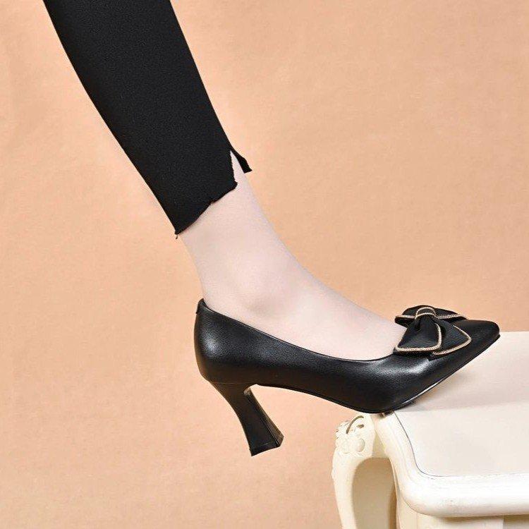 Туфли-лодочки на толстом каблуке женские 2025 новые с острым носком и бантом, с вырезом, рабочие туфли на среднем каблуке, одинарные туфли на тонком каблуке, универсальная женская обувь — купить товар онлайн с бесплатной доставкой по всему миру!
