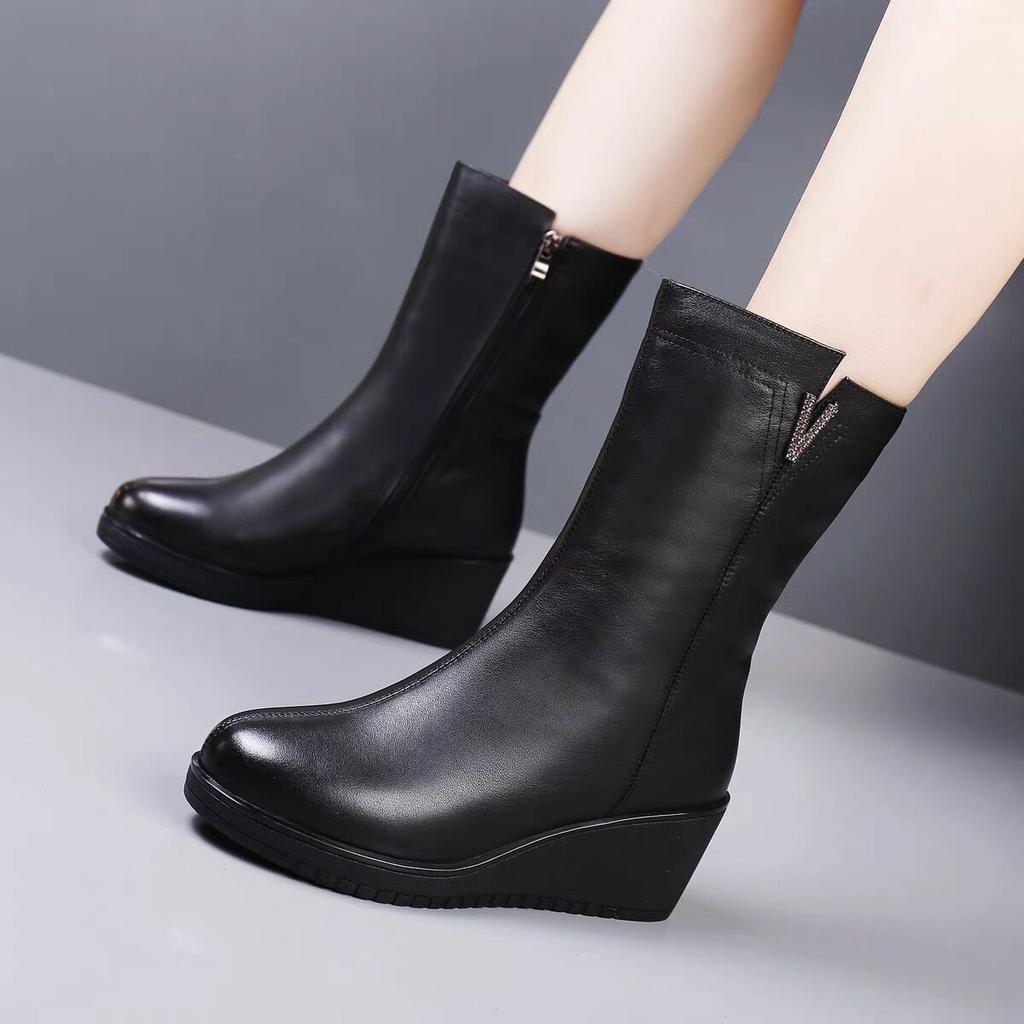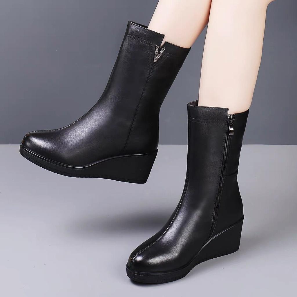 Черные кожаные полусапоги на среднем каблуке с горным хрусталем Женские осенне-зимние модные полусапоги до середины икры на флисовой подкладке 2025 Горячие