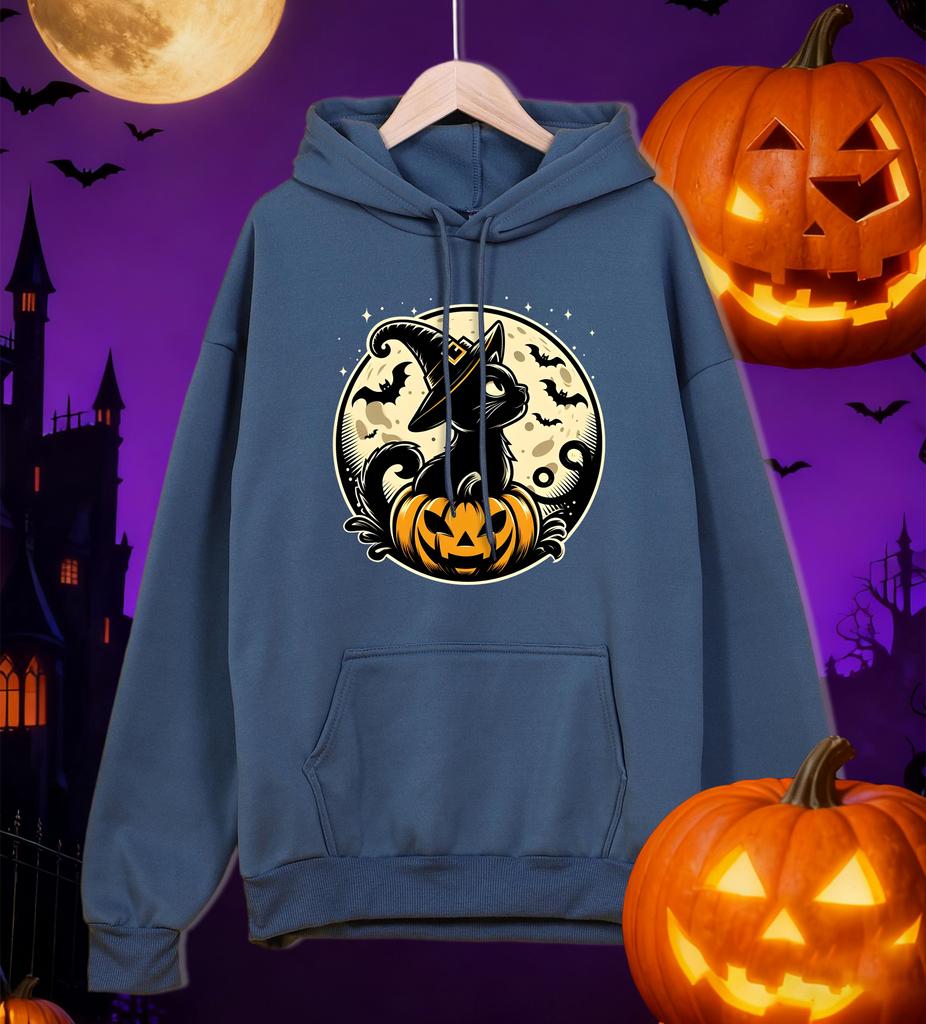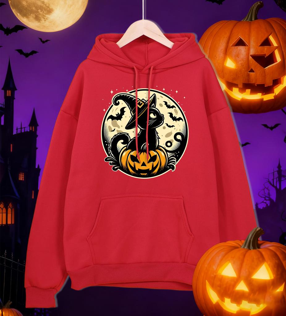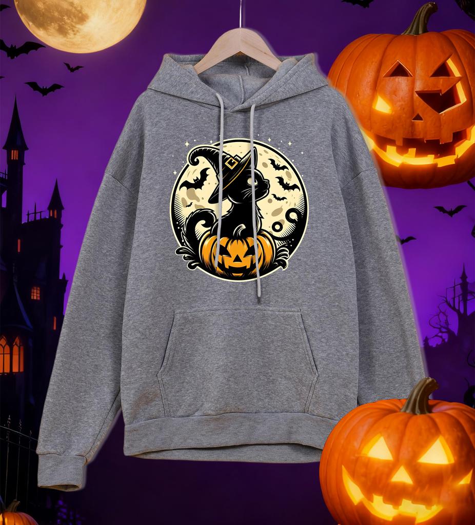 Хэллоуинский котенок стоит на тыкве Печать Мужские толстовки Свободная толстовка Флис Повседневная уличная одежда Универсальная удобная одежда