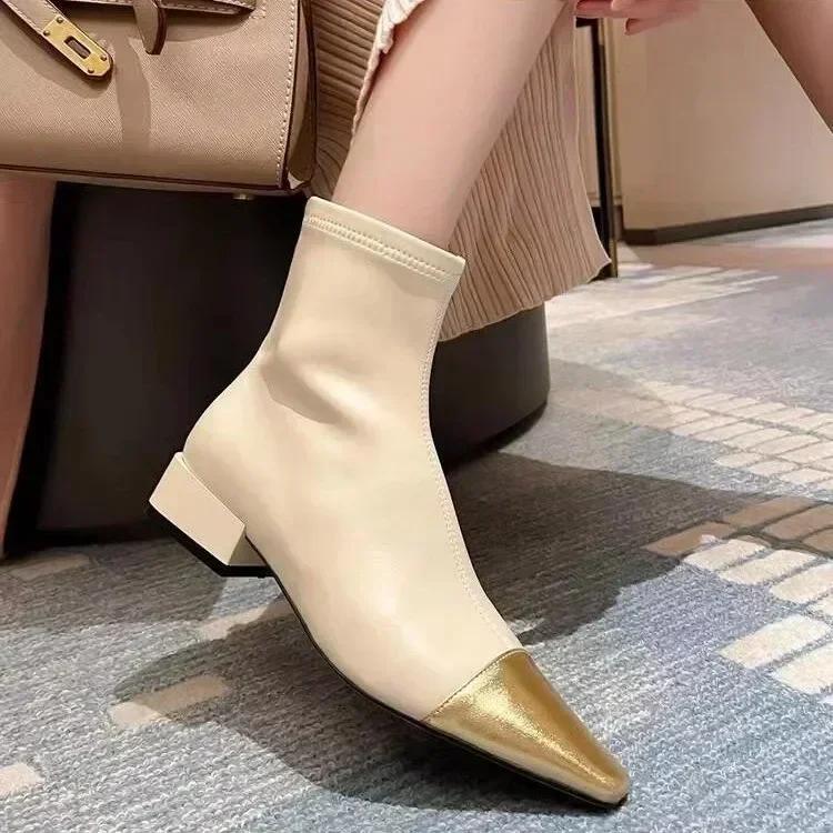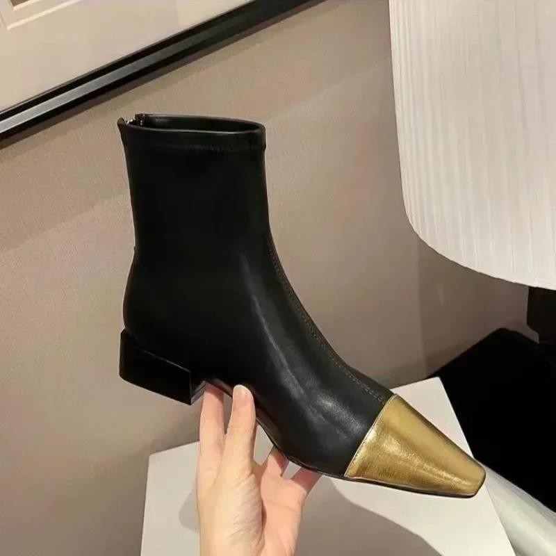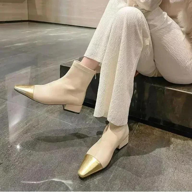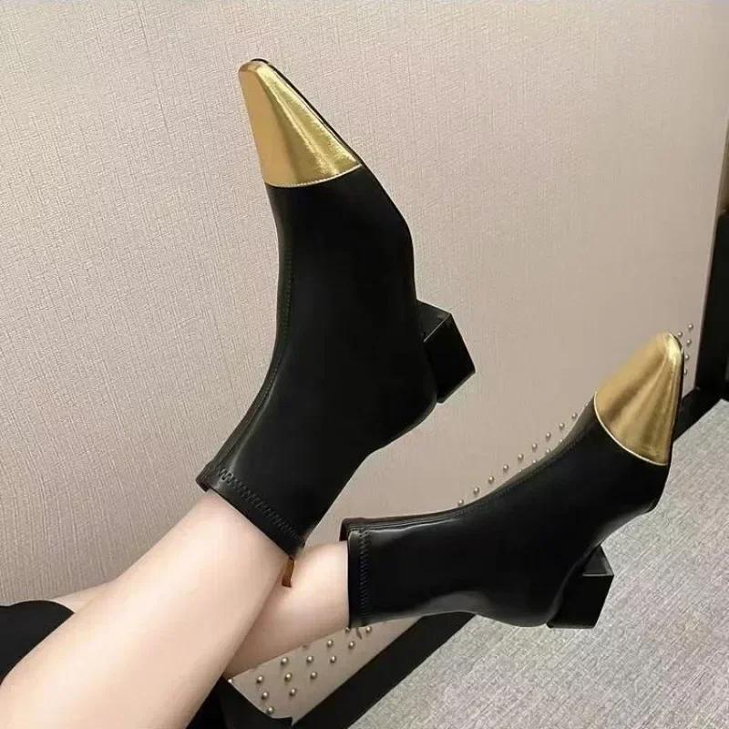 Осенне-зимняя мода Женские ботильоны Золотой носок Острый носок Квадратный каблук Сексуальная женская обувь Задняя молния Противоскользящие Универсальные Гладкие