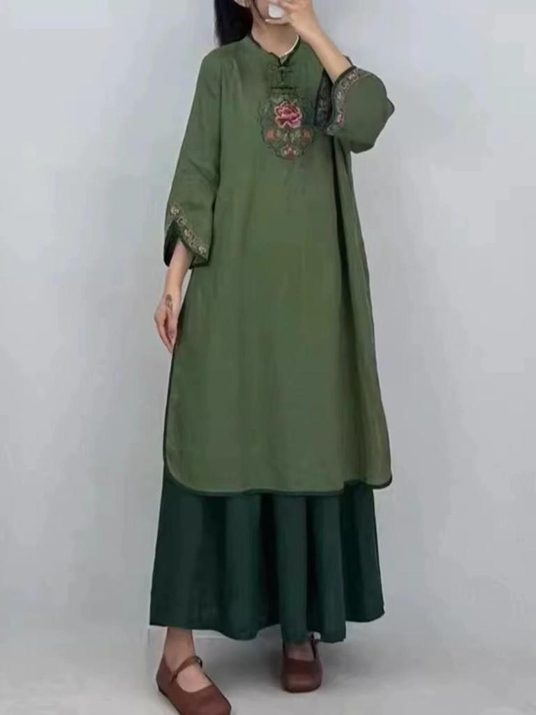 Вышитое хлопково-льняное ципао: Этническое летнее платье средней длины