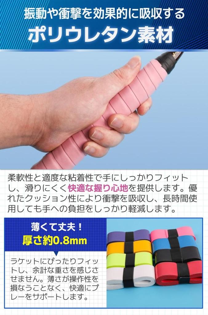 [Approximately 0.8mm thick] It fits snugly to your racket without feeling any extra weight. The thinness supports comfortable play without compromising maneuverability.