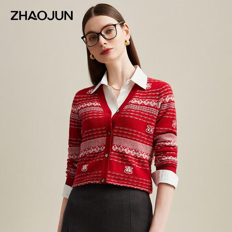 Zhaojun Women's Pure Cashmere V-neck Striped Jacquard Cardigan