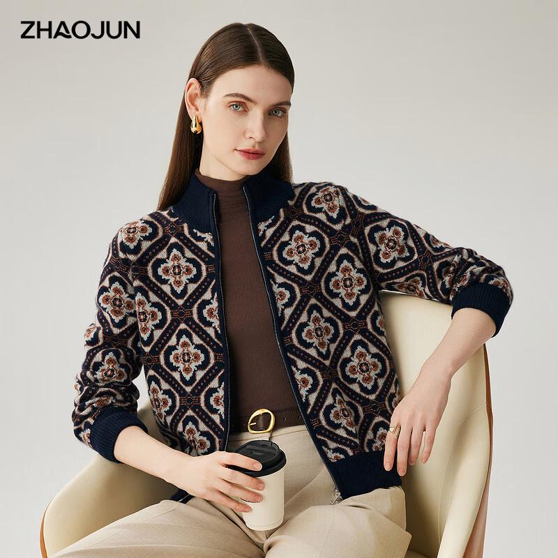 Zhaojun Women's High-Neck Jacquard Cashmere Cardigan