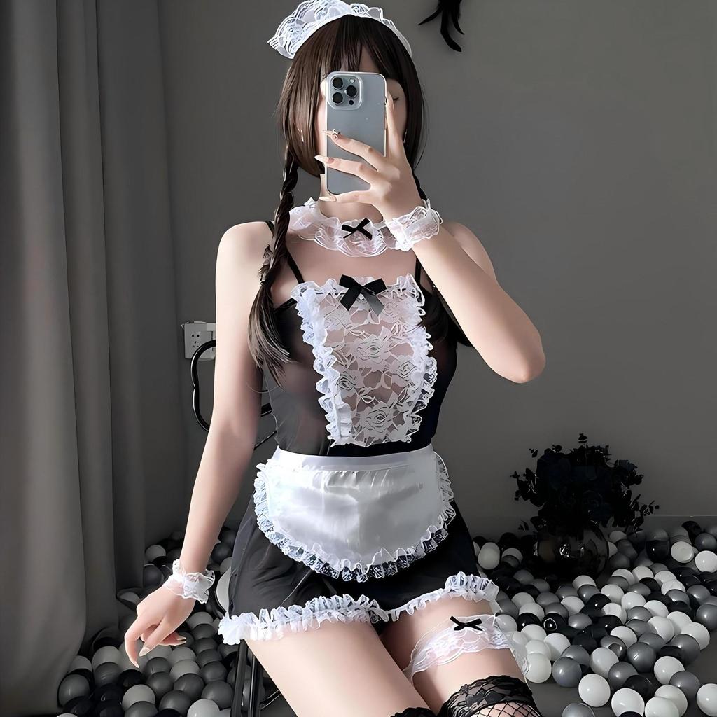 Соблазнительный комплект нижнего белья для горничной: Соблазнительная ночная сорочка с повязкой на голову