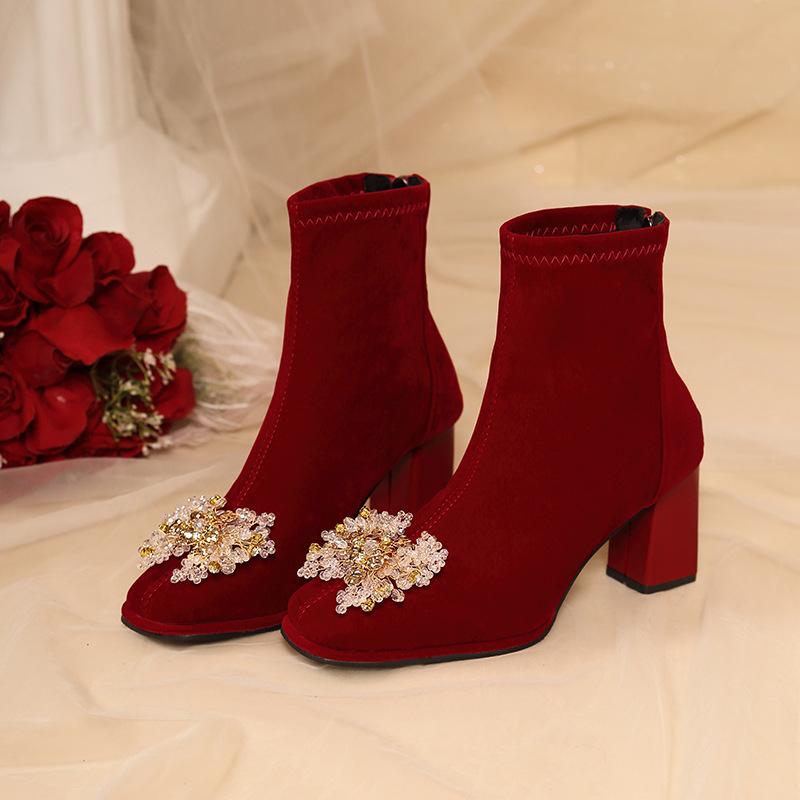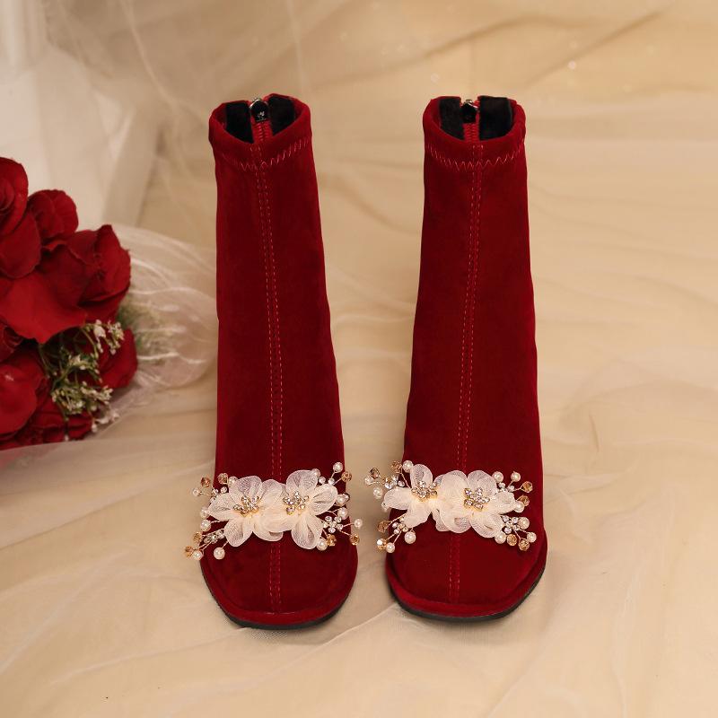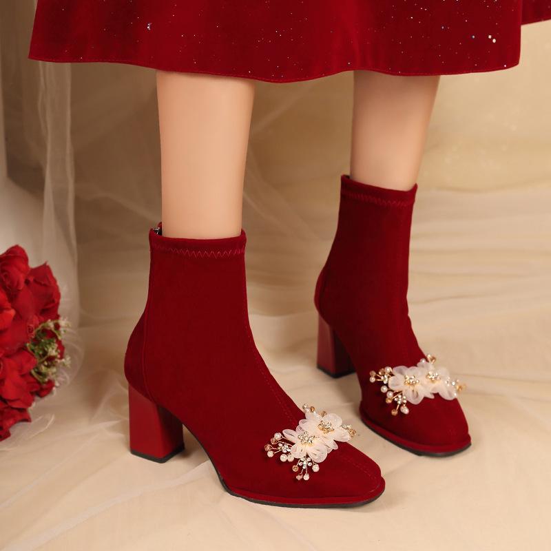 Цветочные ботильоны на толстом каблуке с квадратным носком, водонепроницаемые, из столового бархата, бордовые, свадебные, осенне-зимние, атмосфера 2025, новая модная женская обувь