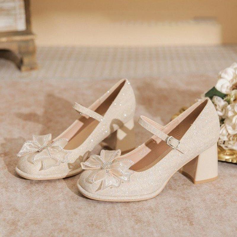 Женские туфли Мэри Джейн с круглым носком, модные одинарные туфли на новом толстом каблуке с блестящим бантом, фееричные туфли на высоком каблуке