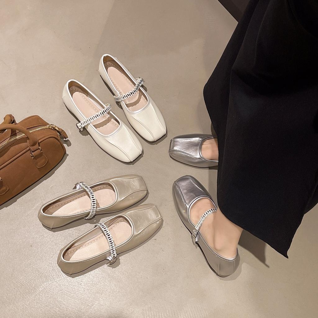 Темпераментная квадратная голова стразы свет рот слово французский новый универсальный серебряный одинарные туфли женские 2025 лето Мэри Джейн маленькие кожаные туфли