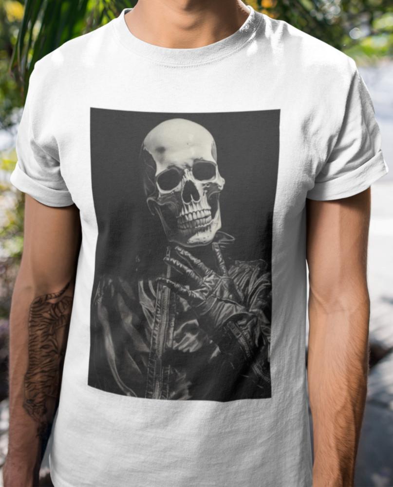 Футболка «Череп в кожаной куртке» – Темная готическая футболка с графикой скелета, Смелый Альтер