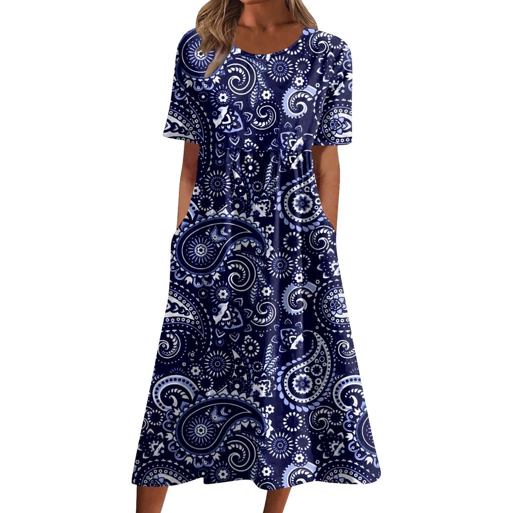 Жен. Повседневные платья Платья с принтами Летние платья С принтами Плиссированные платья-миди с круглым вырезом Классический Классический На открытом воздухе Повседневные С короткими рукавами Свободные платья