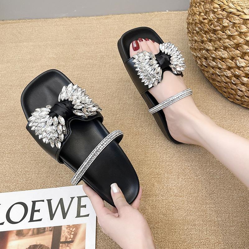 Мягкая кожаная версия! Темпераментный персонализированный бант со стразами, пряжка на одно слово, летние сандалии на низком каблуке, женские туфли-мюли с открытой пяткой