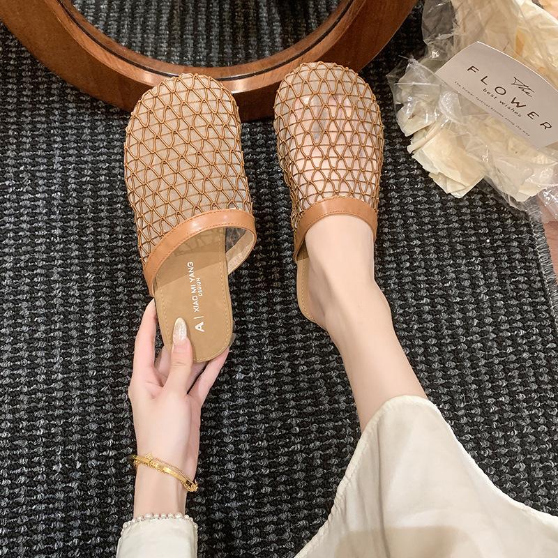 Новые женские летние тапочки-сетки, тапочки с открытой пяткой, тапочки из полой сетки, прохладные тапочки, дышащие сандалии на плоской подошве