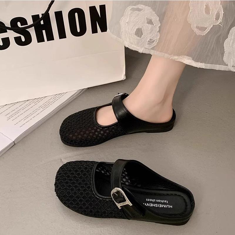 Французский хлеб-юбка 2025 новый сетчатый полупротивень дышащие сандалии на плоской подошве с полым носком полушлепанцы женские летние