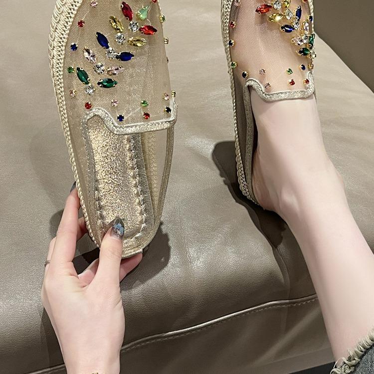 Сетчатая сумка голова сандалии на плоской подошве женская обувь новые цветные бриллианты вышивка без каблука ленивые полушлепанцы рыбацкая обувь летом