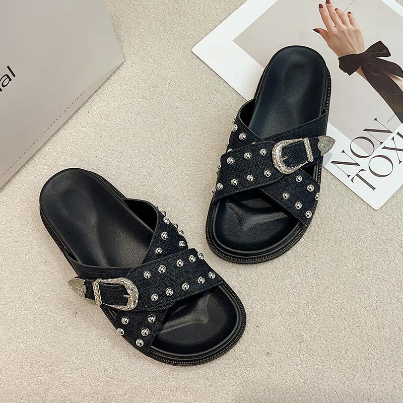 Женские шлепанцы большого размера на толстой подошве, лето 2025, новинка, европейский и американский стиль, универсальные шлепанцы на одной перемычке, украшенные заклепками и ремешком с пряжкой