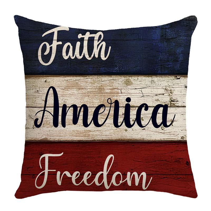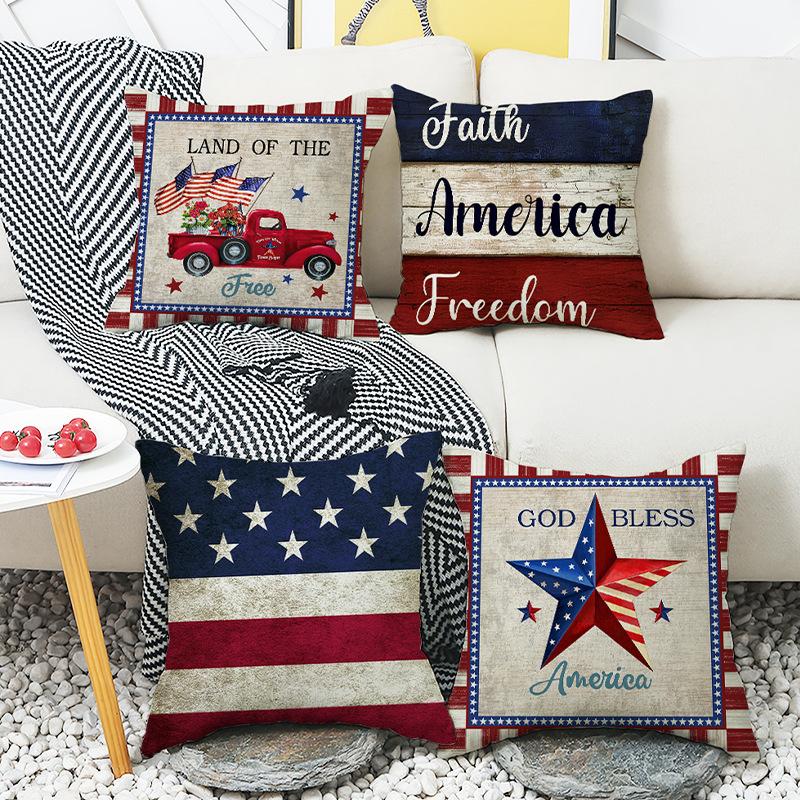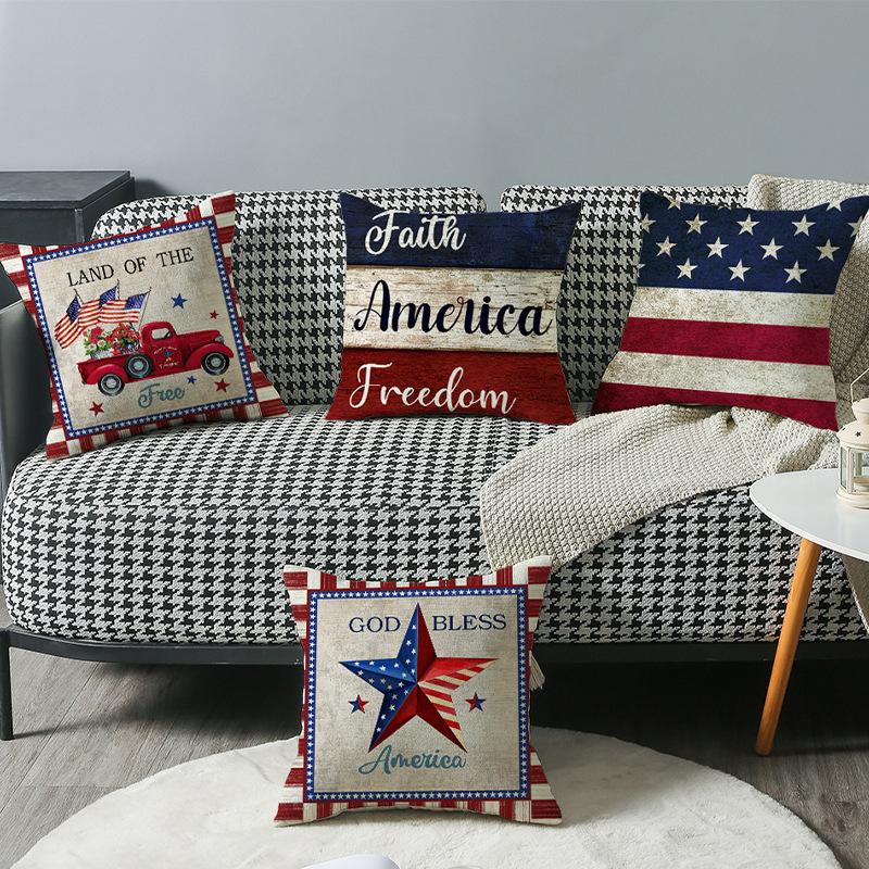 Набор из четырех предметов ко Дню Независимости, Льняной материал, Наволочка для домашней подушки, Пятиконечная звезда, Синий, Белый и Красный полосатый принт с буквами