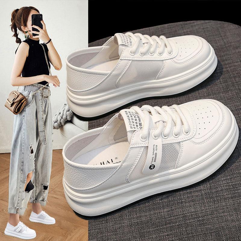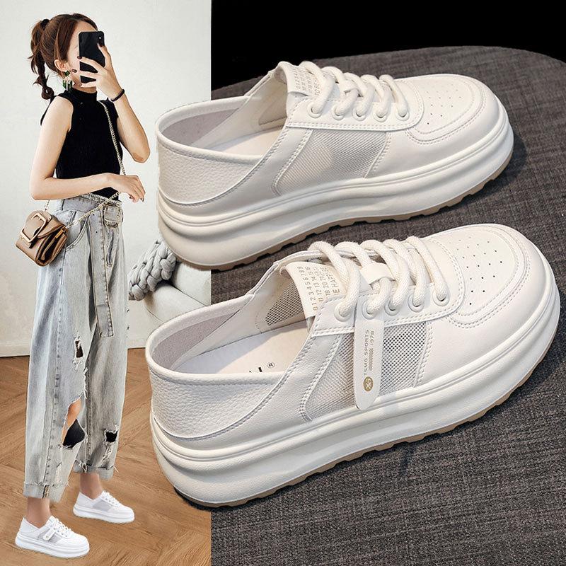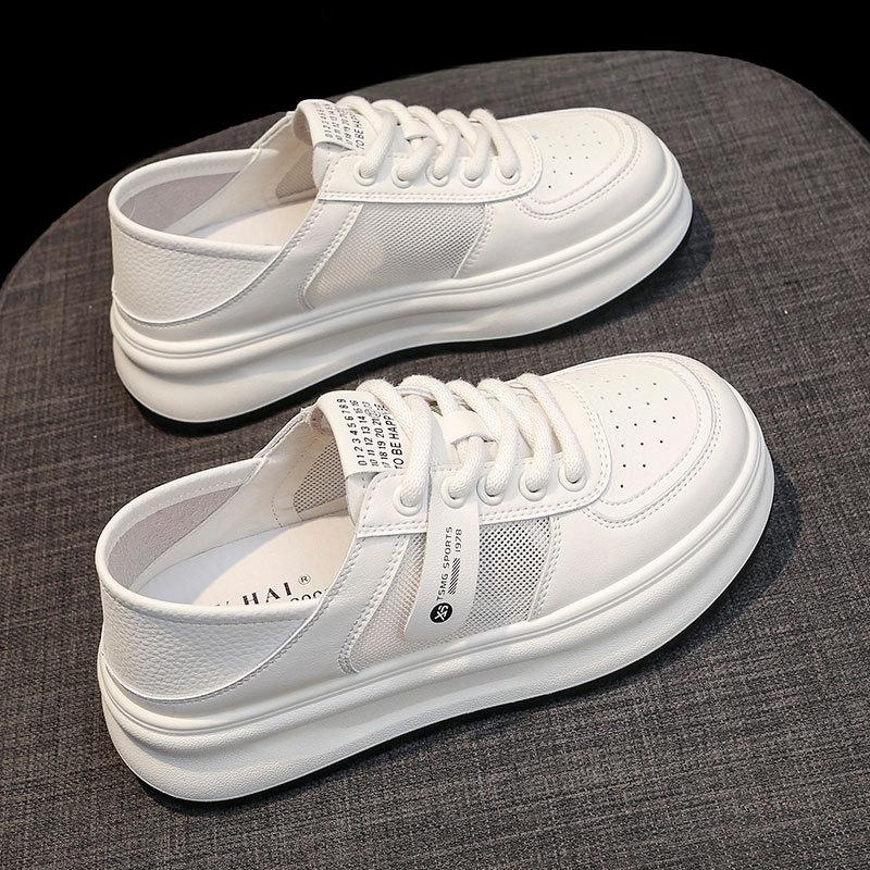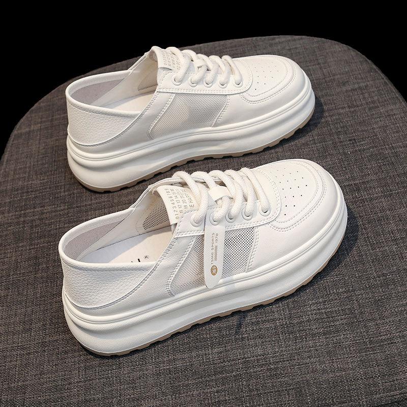Кожаные сетчатые дышащие летние белые туфли, женская обувь, новые туфли на толстой подошве, увеличивающие рост, повседневные туфли из двух предметов, одинарные туфли