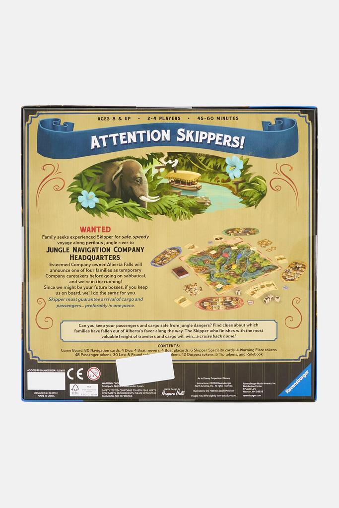 ЧТО ВХОДИТ В КОМПЛЕКТ - Disney Jungle Cruise включает 1 игровое поле, 80 навигационных карт, 4 кубика (1 кубик движения, 3 кубика опасности), 4 фишки лодок, 4 таблички лодок, 6 карт «Особый скипер», 4 жетона «Предупредительный выстрел», 48 жетонов пассажиров, 31 жетон реки, 4 жетона экипажа, 12 жетонов форпостов, 5 жетонов-чипов и свод правил.