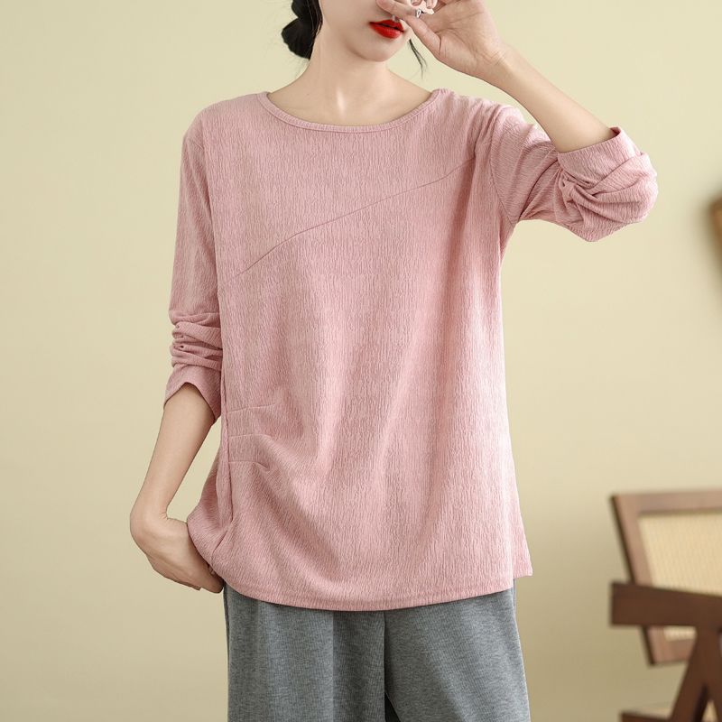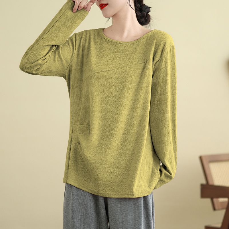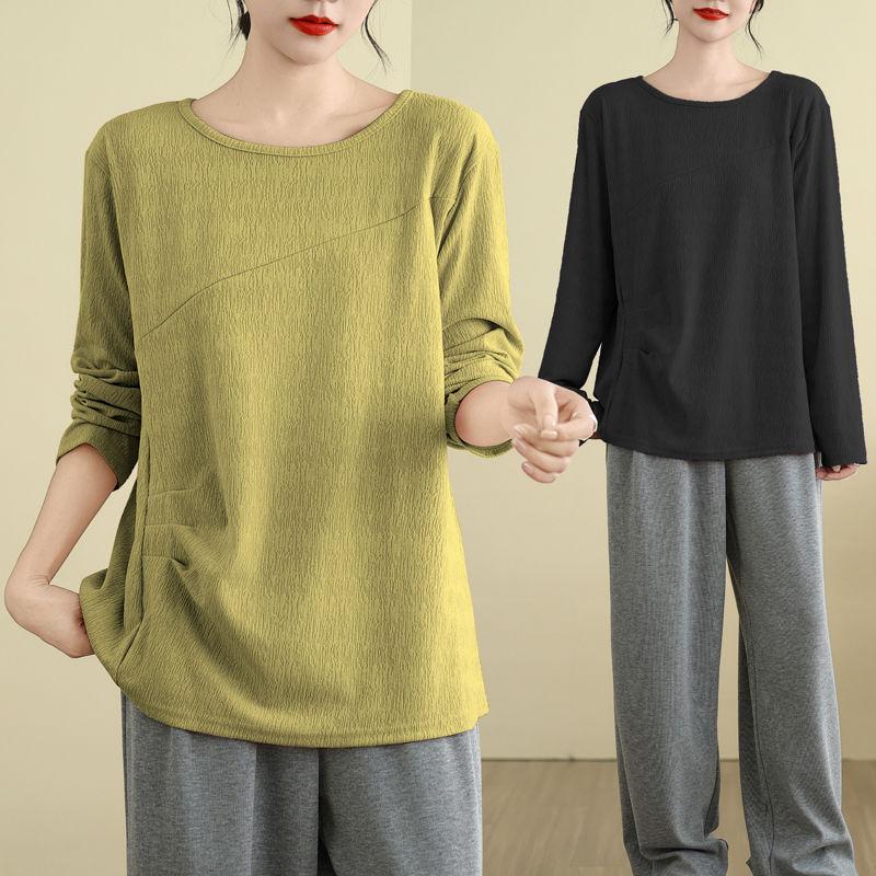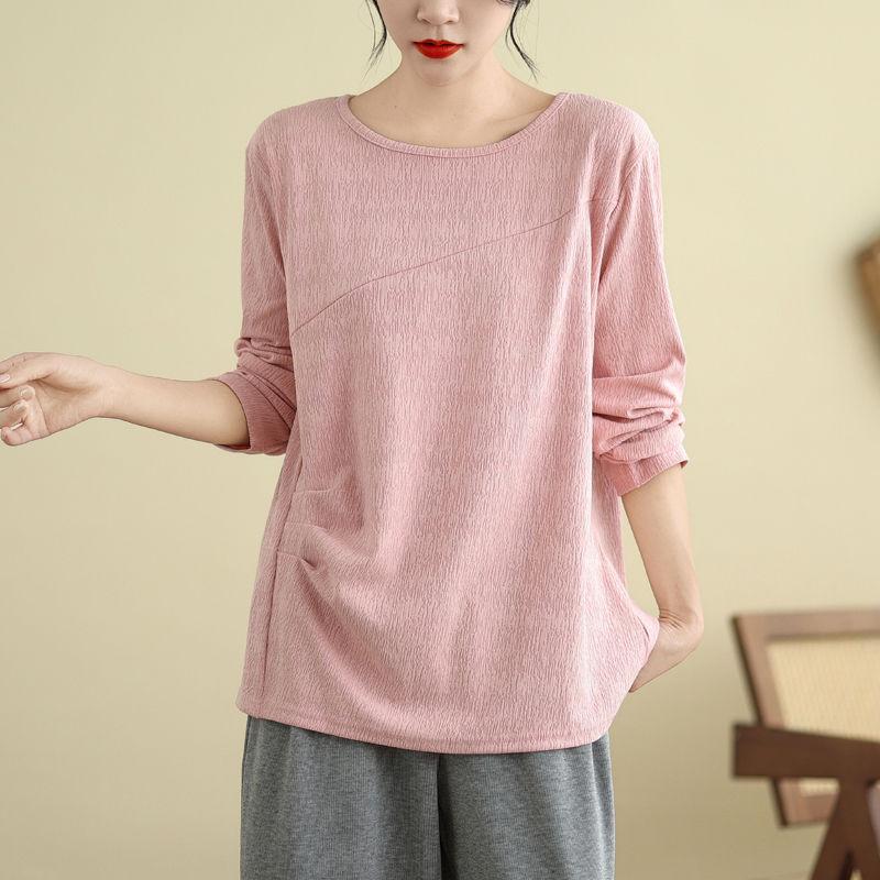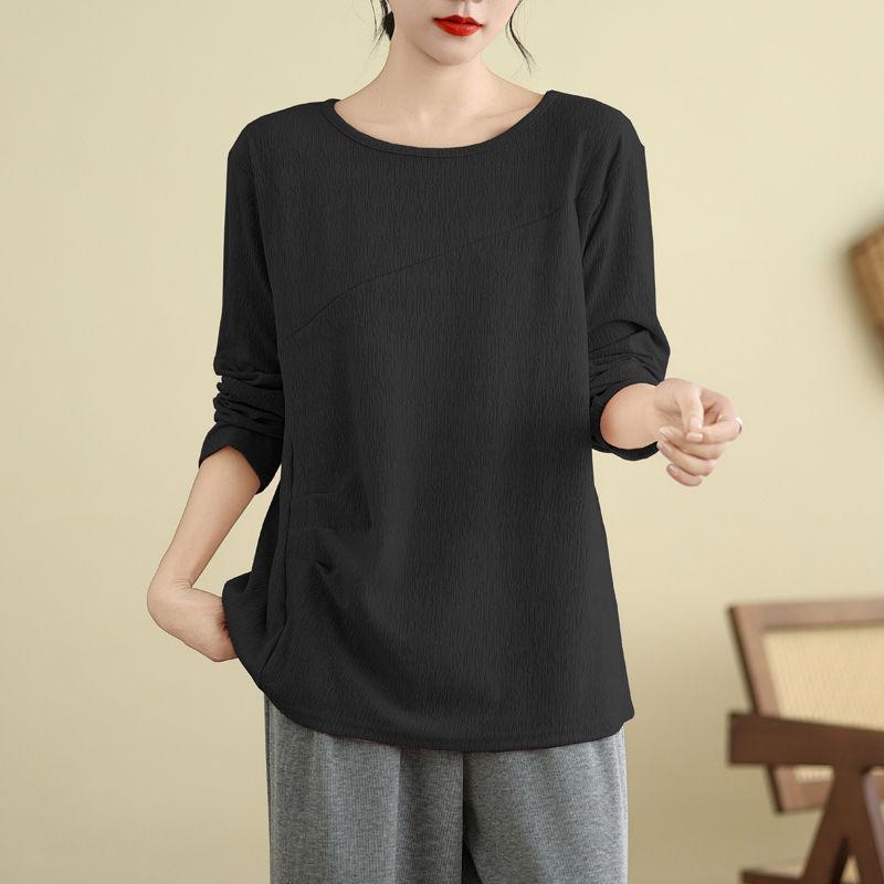 Футболка, топы, женская хлопковая блузка, свободная, удобная, эластичная, с длинным рукавом, однотонная, с круглым вырезом, свободные топы
