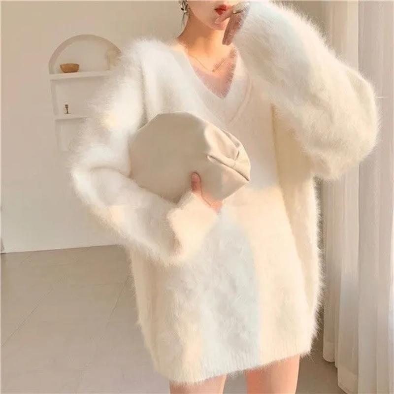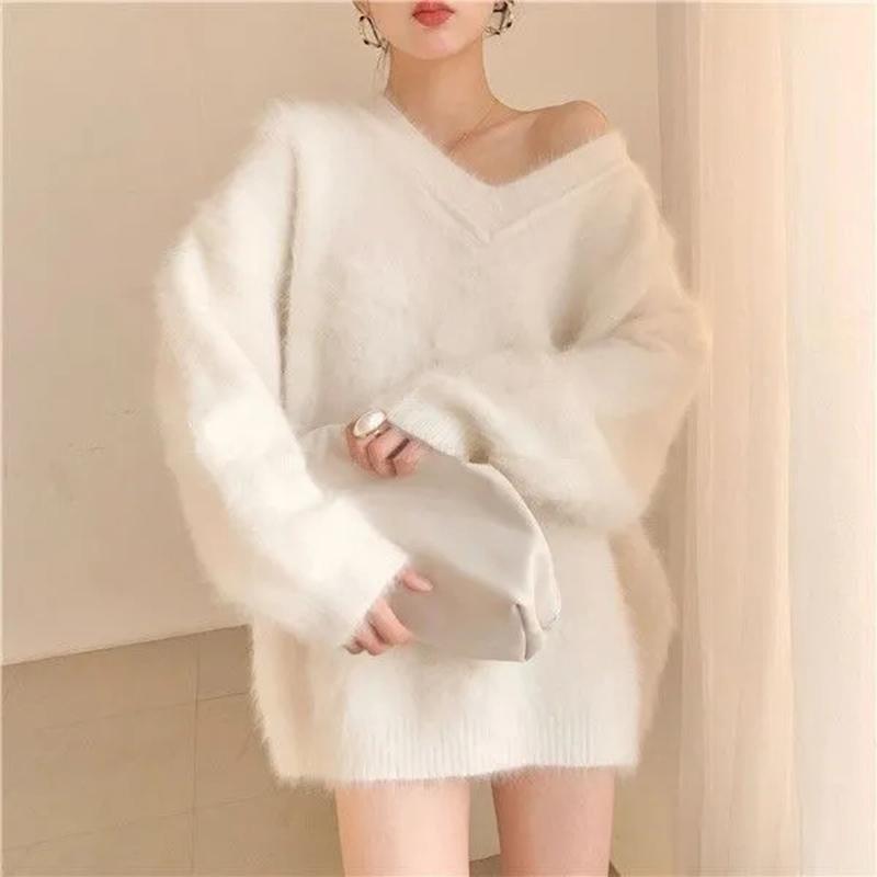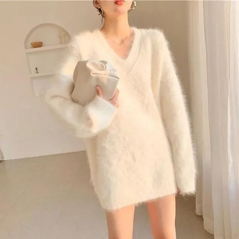 Утепленный свитер с v-образным вырезом, женский осенне-зимний свитер средней длины, большого размера, свободные теплые топы, удобный повседневный эластичный пуловер, свитер