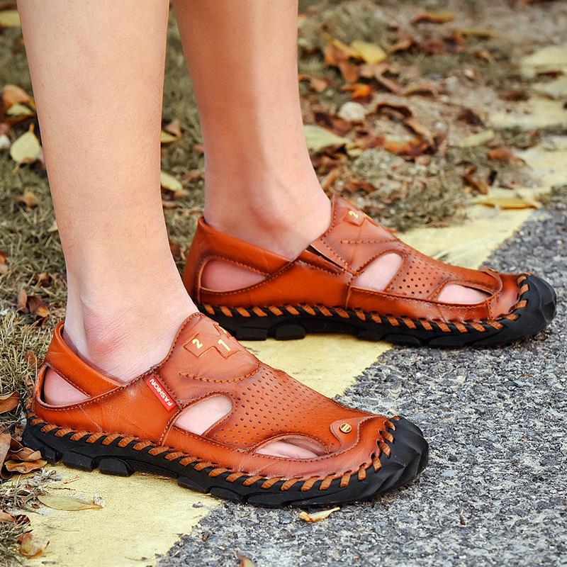 Летние мужские сандалии из воловьей кожи с закрытым носком, летние кожаные сандалии для вождения из натуральной кожи, нескользящая пляжная обувь с мягкой подошвой