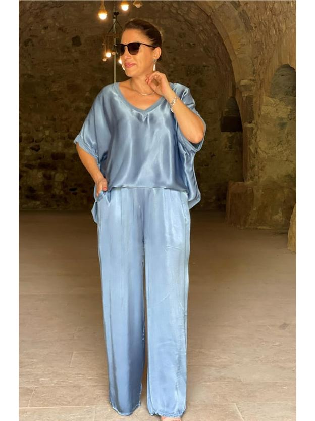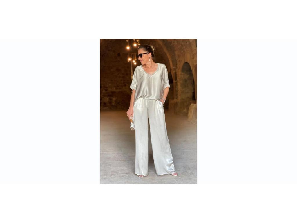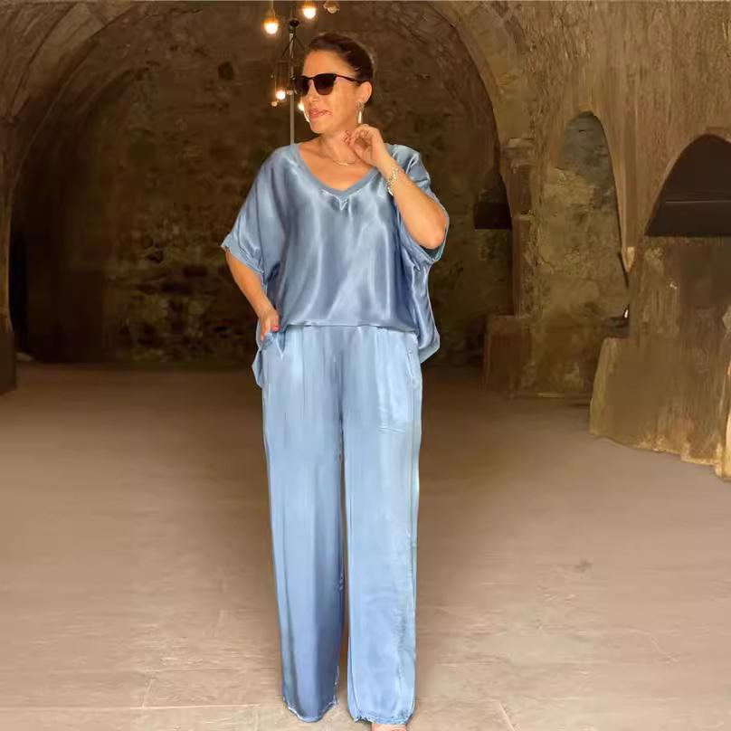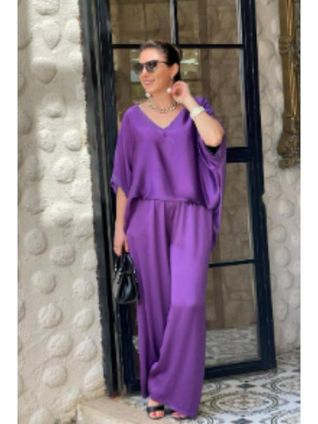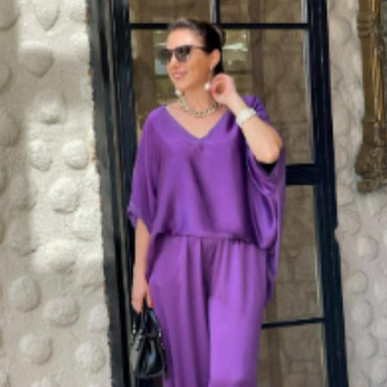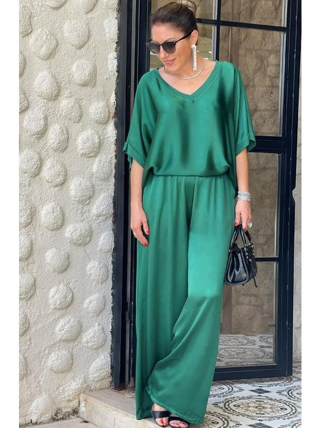 Поднимите свой повседневный гардероб на новый уровень с этим стильным комплектом с коротким рукавом и брюками широкого кроя.. Этот ансамбль, выполненный в спортивном стиле, предлагает расслабленный, но шикарный образ для любого случая.. Изготовлено из роскошного атласа, обеспечивает гладкую и шелковистую текстуру, гарантируя комфорт и элегантность.. Лестный V-образный вырез добавляет нотку изысканности, делая этот комплект универсальным дополнением к вашему модному гардеробу, идеальным как для непринужденных прогулок, так и для более изысканных мероприятий.