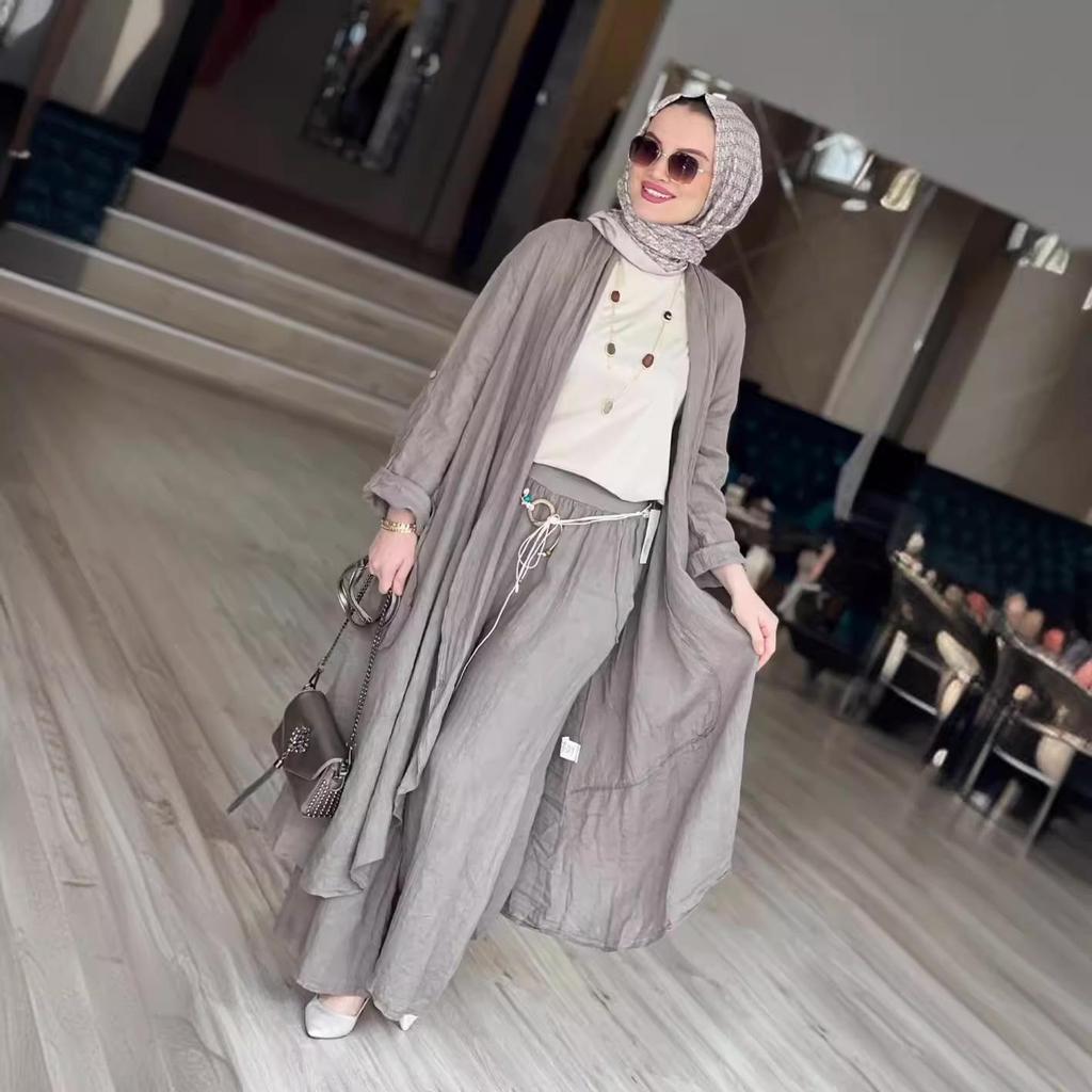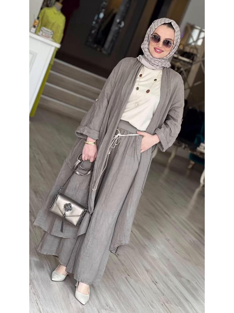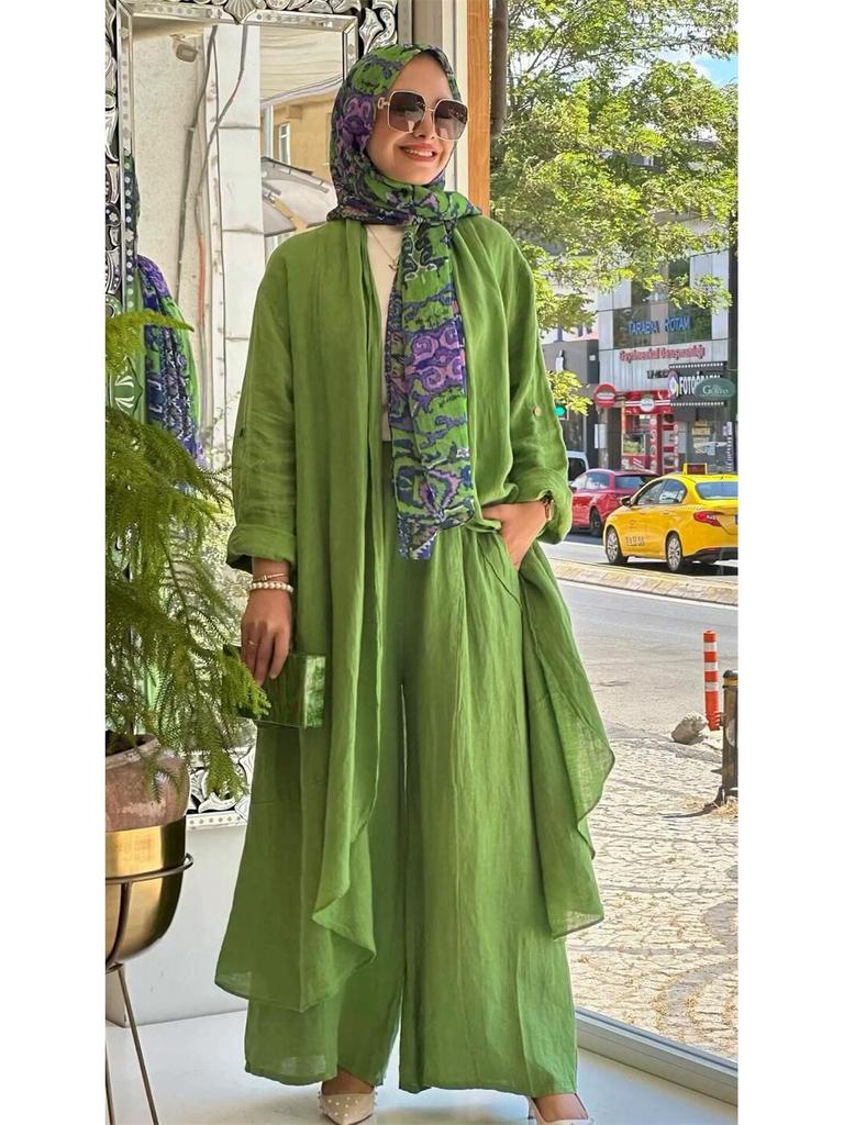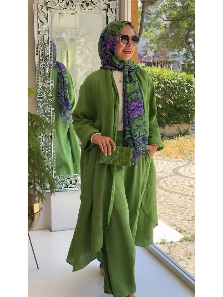 Этот шикарный и удобный костюм-двойка идеально подходит для наступления теплых месяцев. Комплект состоит из свободного длинного кардигана и подходящих брюк широкого кроя, оба изделия изготовлены из высококачественного полиэстера для легкого и дышащего ощущения.. Однотонный узор дополнен стильным принтом, добавляющим изюминку вашему повседневному гардеробу.. Изготовленный с отделкой под лен, этот комплект предлагает изысканный, но непринужденный образ, который идеально подходит для любого непринужденного случая.