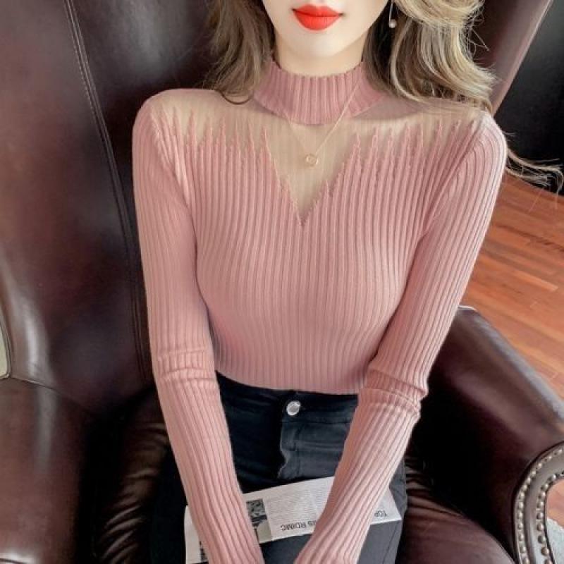 Топ вязаный женский больших размеров с сетчатыми вставками и кружевом, с полувысоким воротником, свитер для осени и зимы, с длинным рукавом, базовый слой