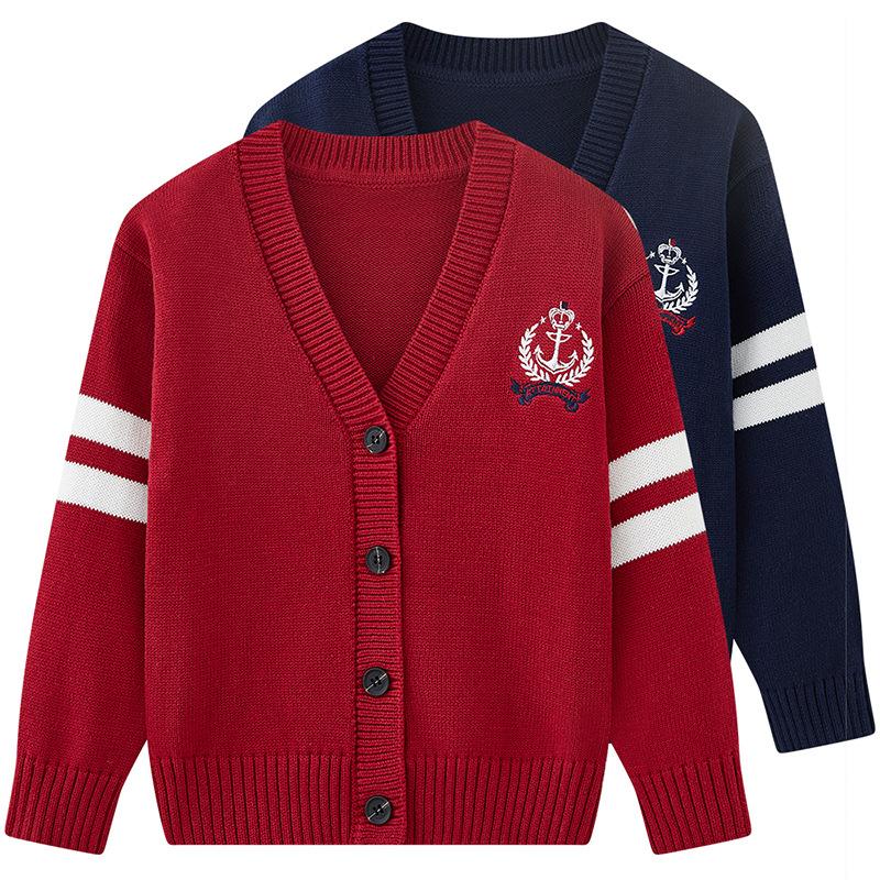 Вязаный кардиган с V-образным вырезом и вышивкой для детей среднего и старшего возраста, куртка с длинными рукавами, весенне-осенний хлопковый вязаный кардиган для мальчиков и девочек
