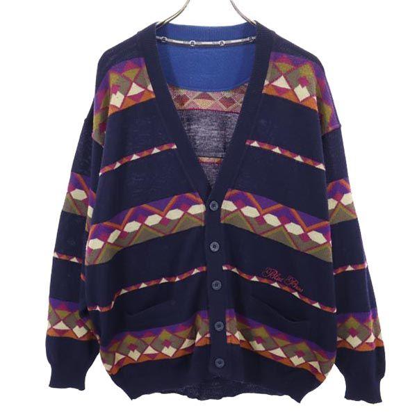 Это старый вязаный кардиган с принтом по всей поверхности 80-х - 90-х годов. Внутренняя бирка отсутствует, поэтому материал неизвестен. Есть немного пуха. На обоих манжетах и по низу есть складки. Размер неизвестен. Пожалуйста, сверьтесь с фактическими размерами.. Пожалуйста, поймите, что это винтажный предмет, прежде чем покупать.