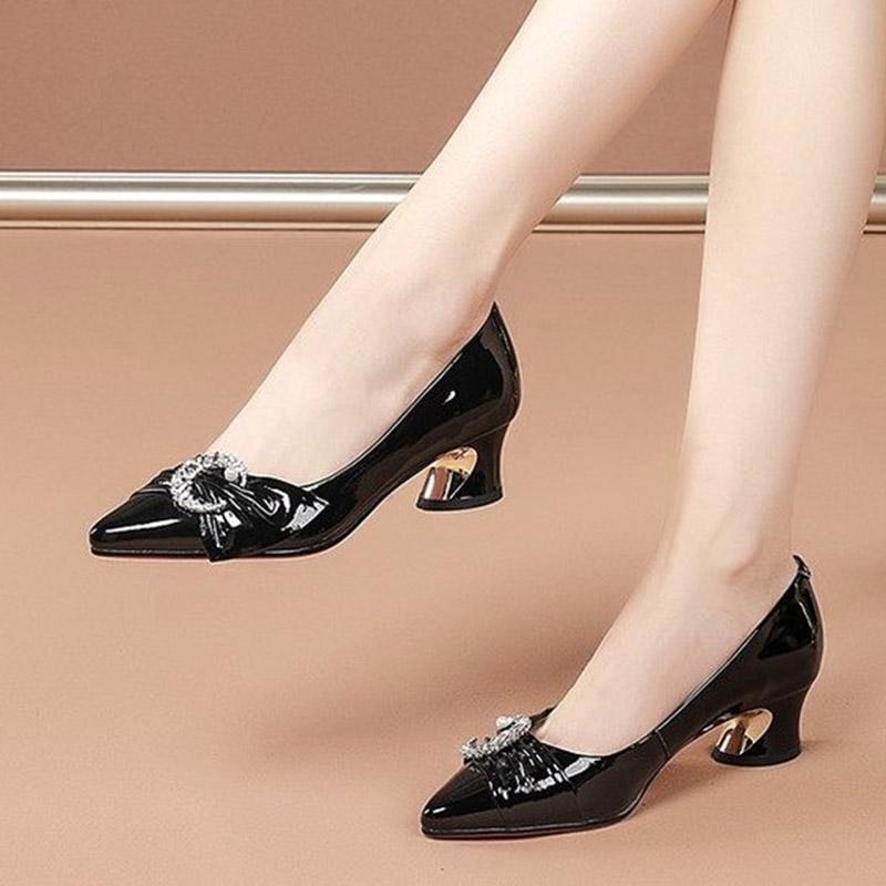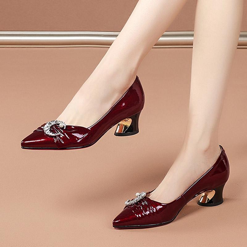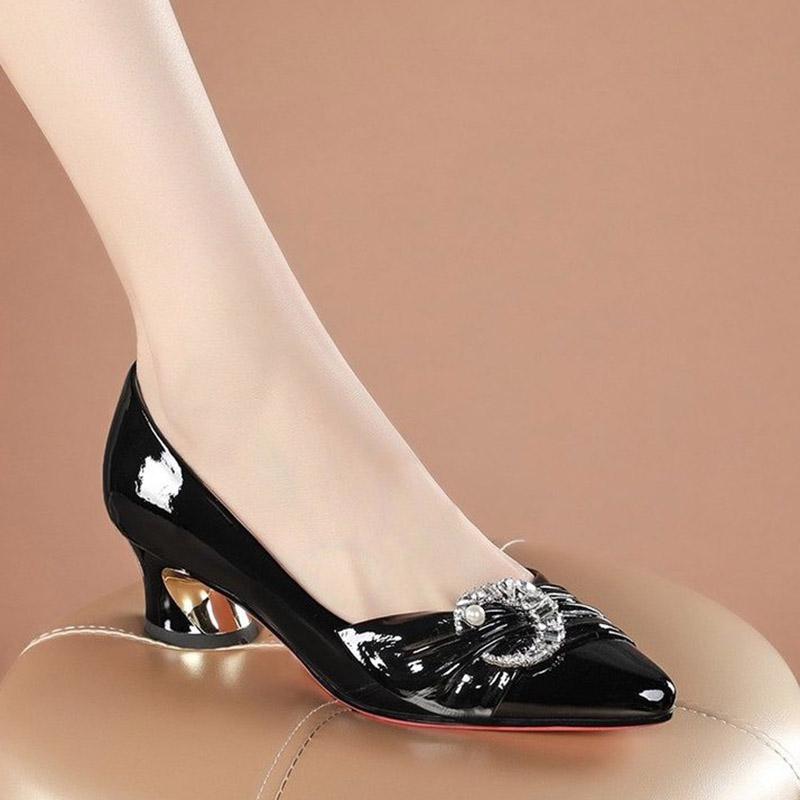 Большие размеры 35–42, женские туфли-лодочки из лакированной кожи с жемчугом, модельные туфли на среднем каблуке, женская обувь с острым носком и лунными кристаллами, 9120n
