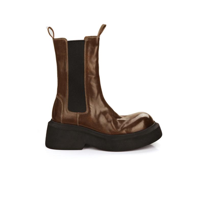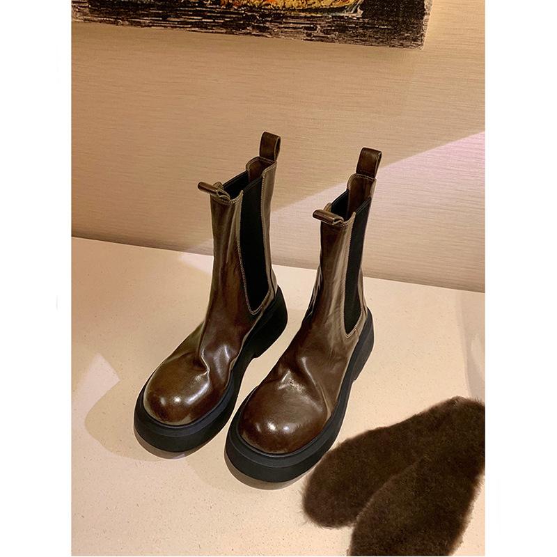 Версия из коровьей кожи~ У Grape Mom такие же челси на толстой подошве, короткие ботинки для женщин с круглым носком, эластичной вставкой, толстым каблуком, средней высоты голенищем, ботинки Мартин.