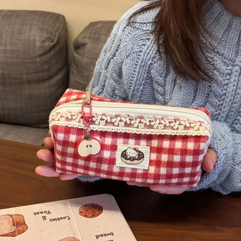 Милый Кот Кружево Ретро Рождество Клетка Шерстяной Пенал Студенческие Канцелярские Школьные Принадлежности Снова в Школу Кавайный Пенал
