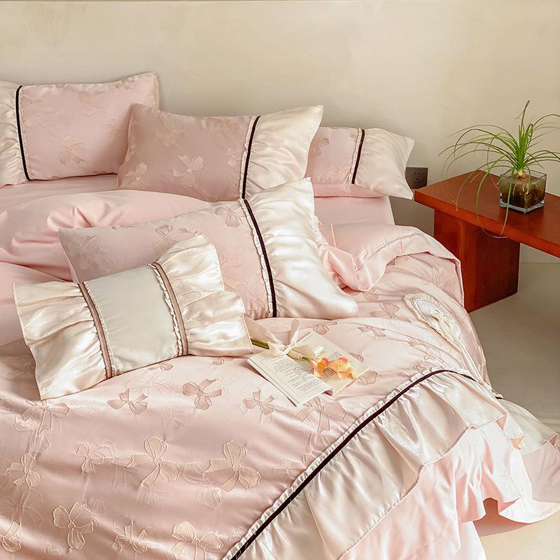 Шелковый Постельный Комплект Четыре предмета Охлаждающий Ледяной Шелк Кружево Приятный к коже Удобный и Дышащий Стиранный Пододеяльник Простыня Наволочка