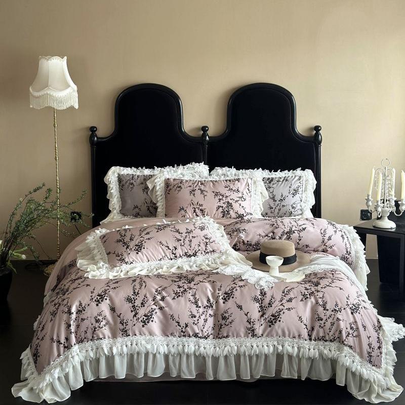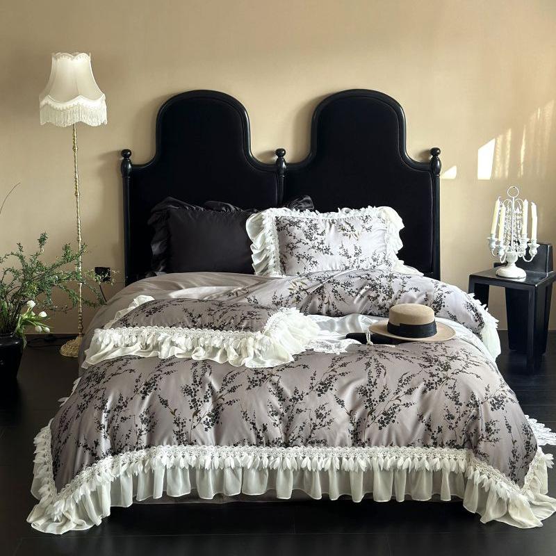 Постельное белье из хлопка тенсель, комплект из четырех предметов, средневековая легкая роскошь, модный ретро-принт с шифоновым кружевом, шелковисто-гладкий пододеяльник и простыни