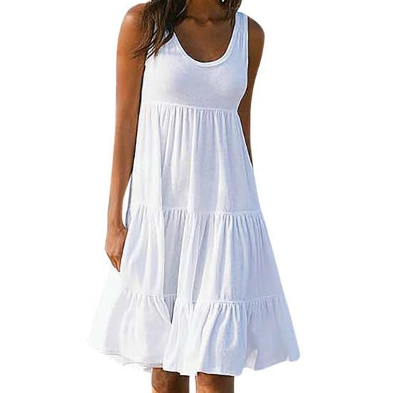 Плюс размер женщин сплошной цвет без рукавов с круглым вырезом шить плиссированное платье трапециевидной формы
