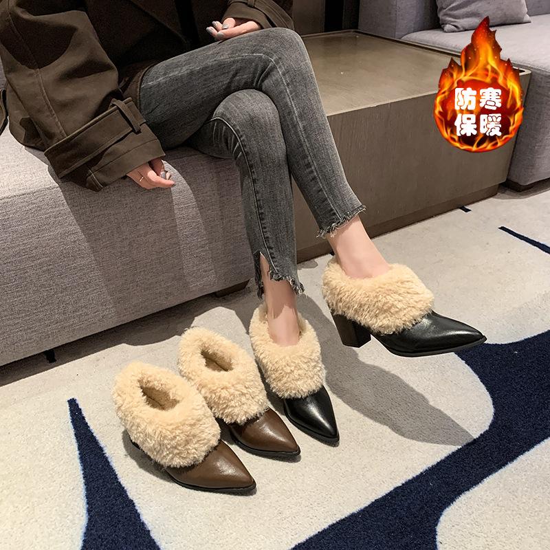 Версия из овчины~ высококлассные остроносые лоферы женские ретро на одной педали пушистые одинарные туфли на высоком каблуке толстый бархат теплые хлопковые туфли