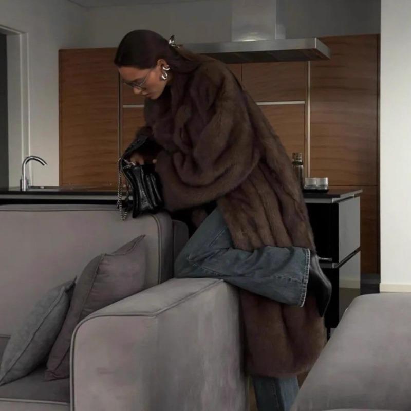 Зимняя коричневая шуба удлиненный ретро костюмный воротник шуба из искусственного меха высококлассная шуба из лисьего меха женская