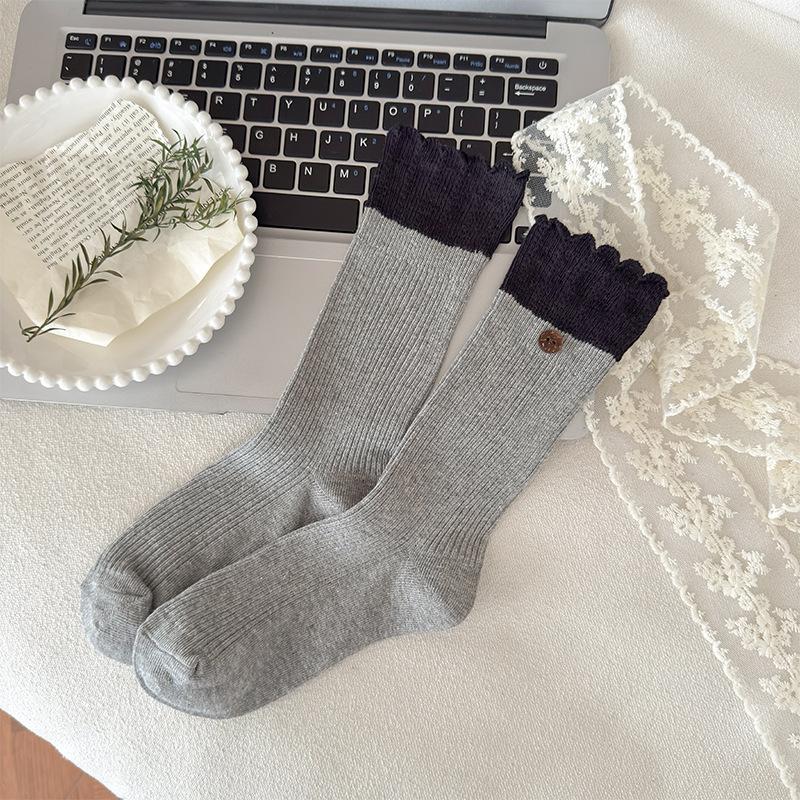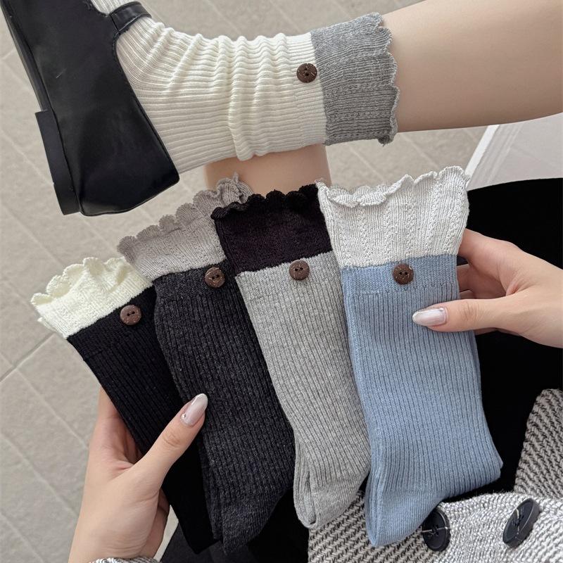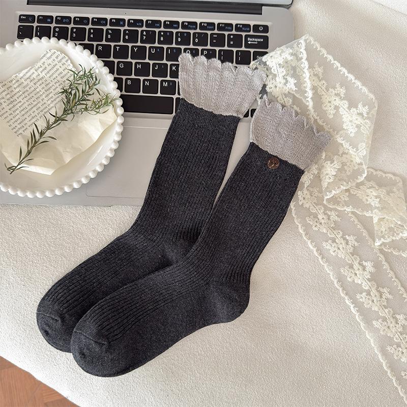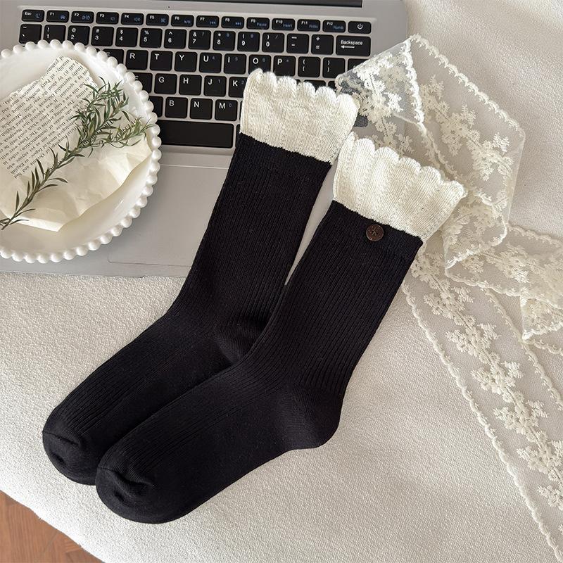 Женские осенне-зимние носки с отворотом на пуговицах, кружевные, средней длины, с отворотом