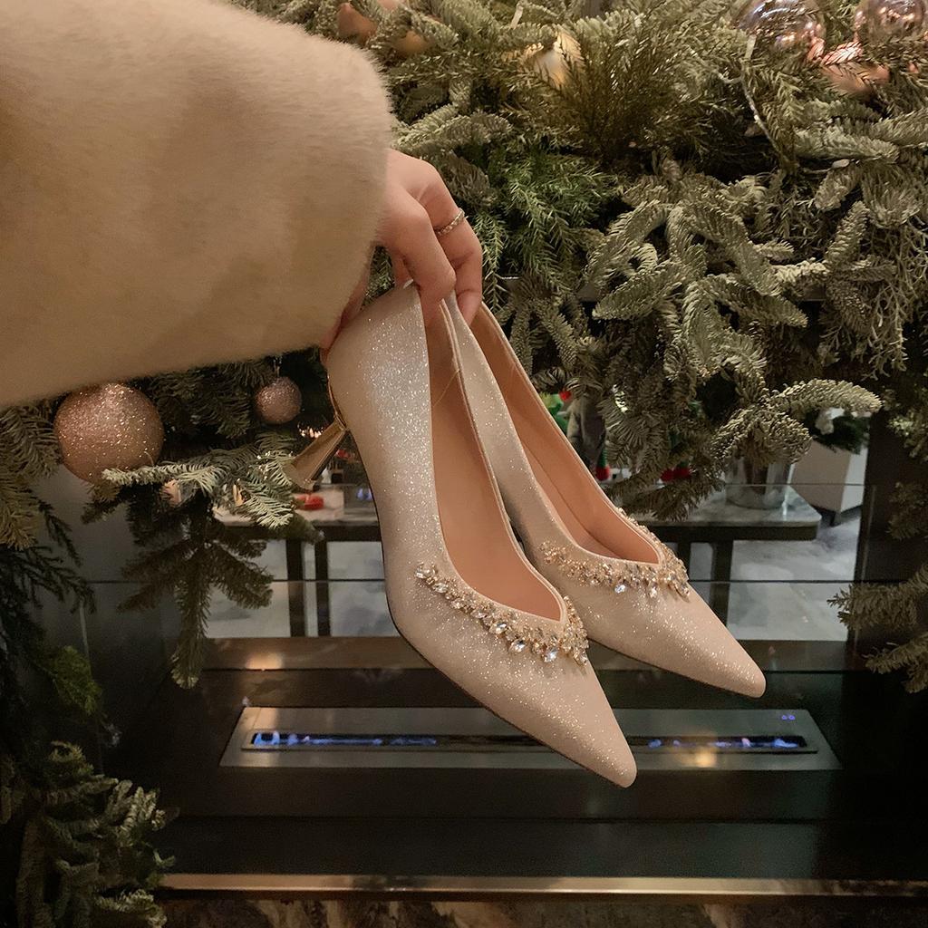 Версия из овчины матерь винограда, те же сверкающие стразами туфли на каблуке, женский французский темперамент, заостренный носок, тонкий каблук, мелкий вырез, мы