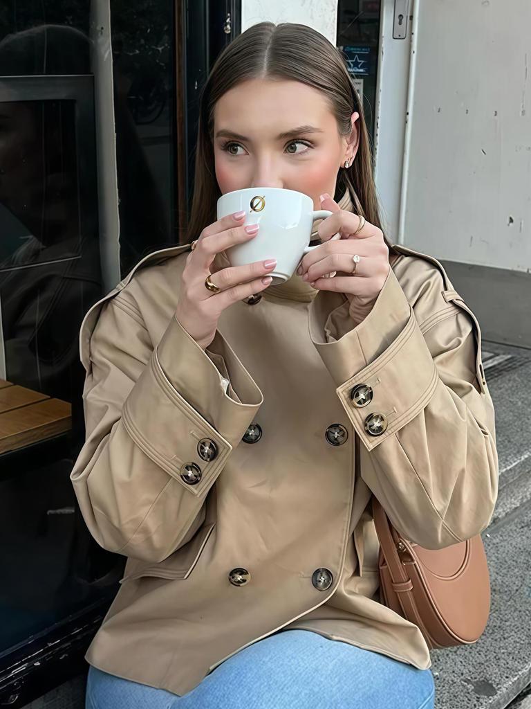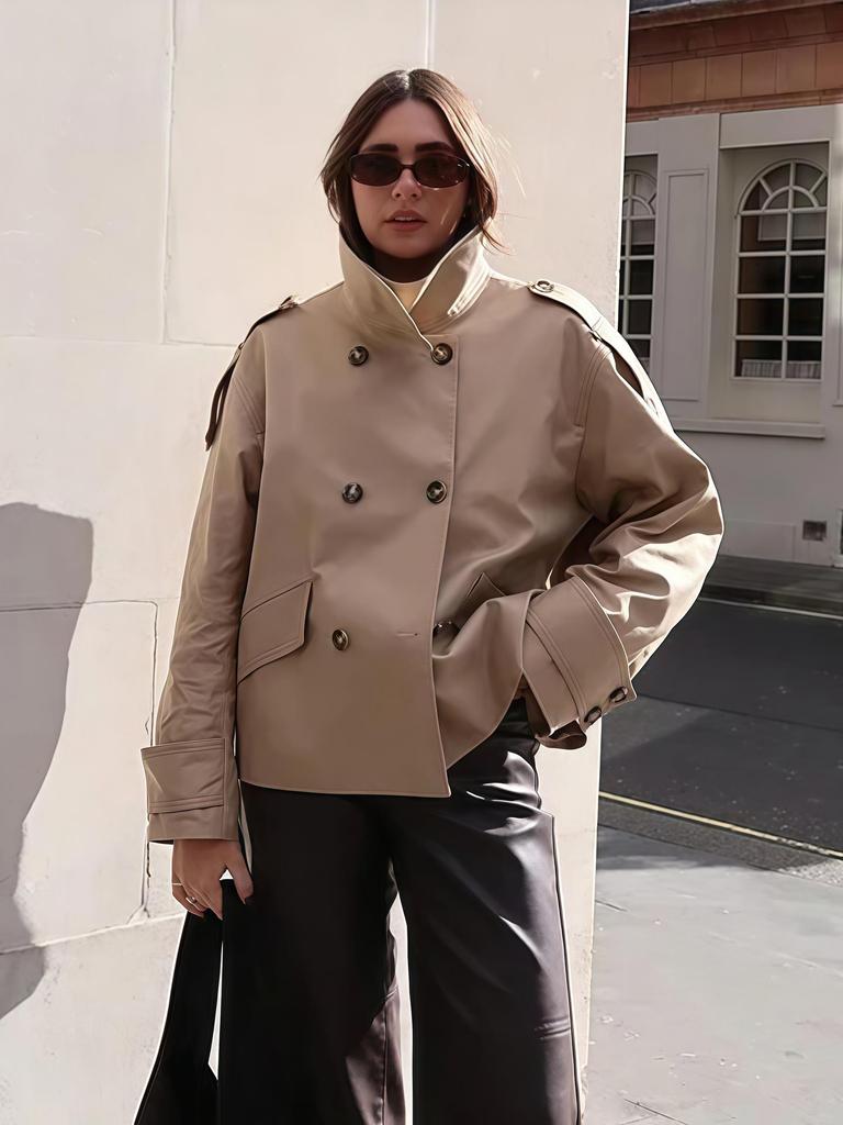 Двубортный короткий тренч в европейском и американском стиле 2025 года со стойкой