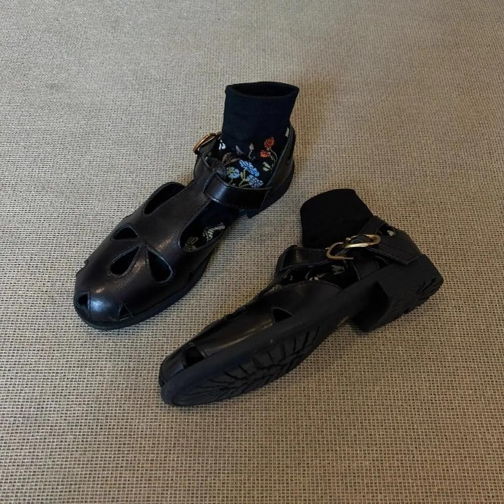 Ретро римский стиль ажурные женские сандалии круглый носок толстый каблук британский стиль ремешок застежка стиль ПУ кожаная обувь