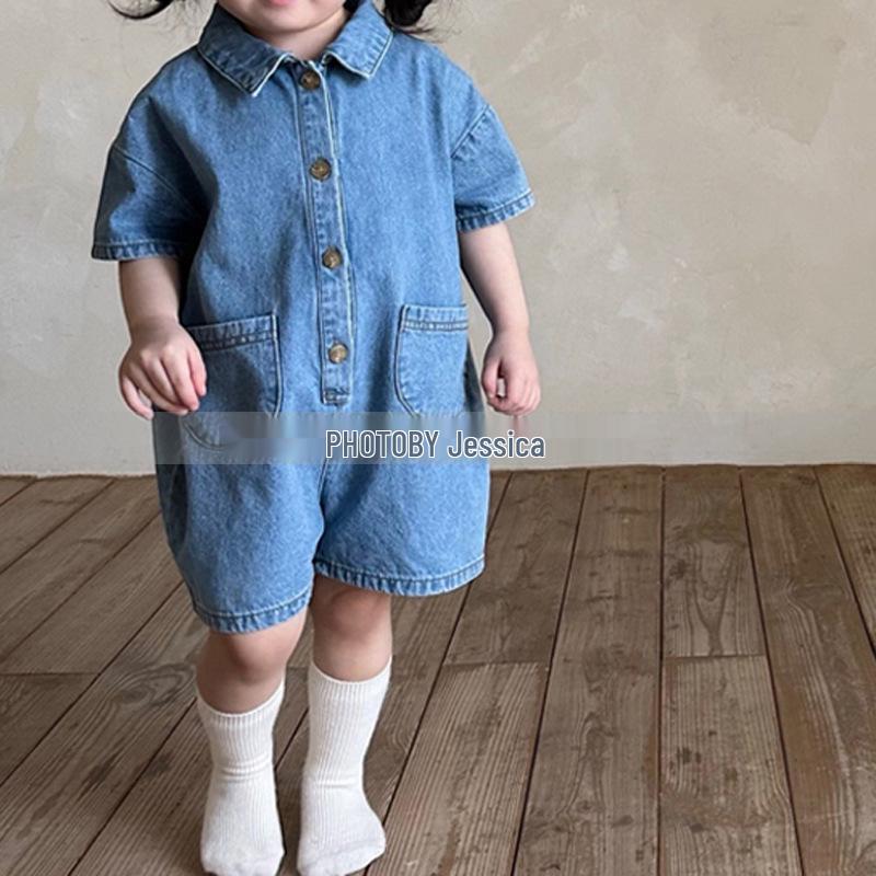 2024 Летний Унисекс Детский Корейский Джинсовый Ромпер Шорты - Модный Комбинезон для Младенцев и Малышей для Прогулок и Ползания