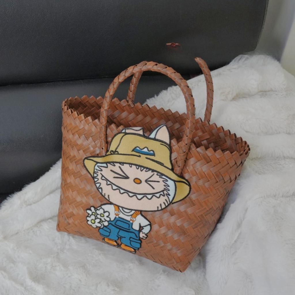 Labubu Летняя новая плетеная сумка-корзина, наплечная сумка, женская сумка, милая сумка из ткани с мультяшным рисунком, ротанговая сумка CLE