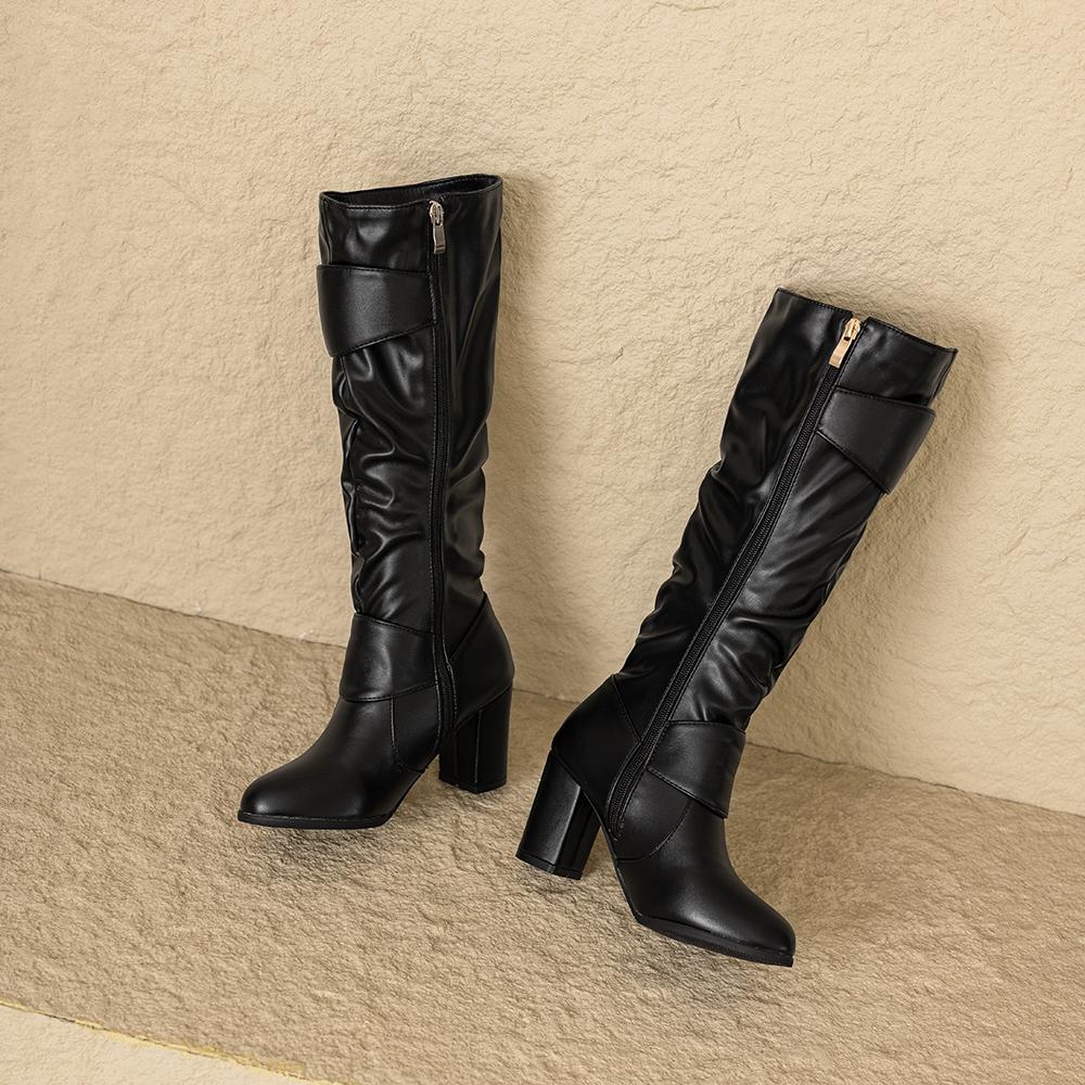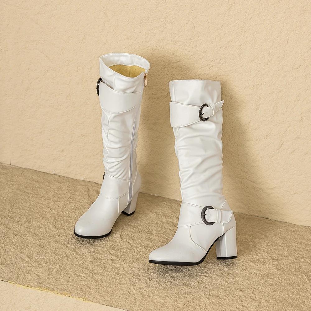 Новые Зимние Милые Черно-Белые Женские Сапоги до Колена Сексуальные Квадратные Высокие Каблуки Женские Сапоги для Верховой Езды Плюс Маленький Большой Размер