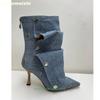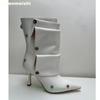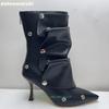 Металлическая пряжка-заклепка Плиссированные женские ботинки 2025 Зима Острый носок Тонкий каблук Короткие ботинки Однотонные Задняя молния Кожаные ботинки
