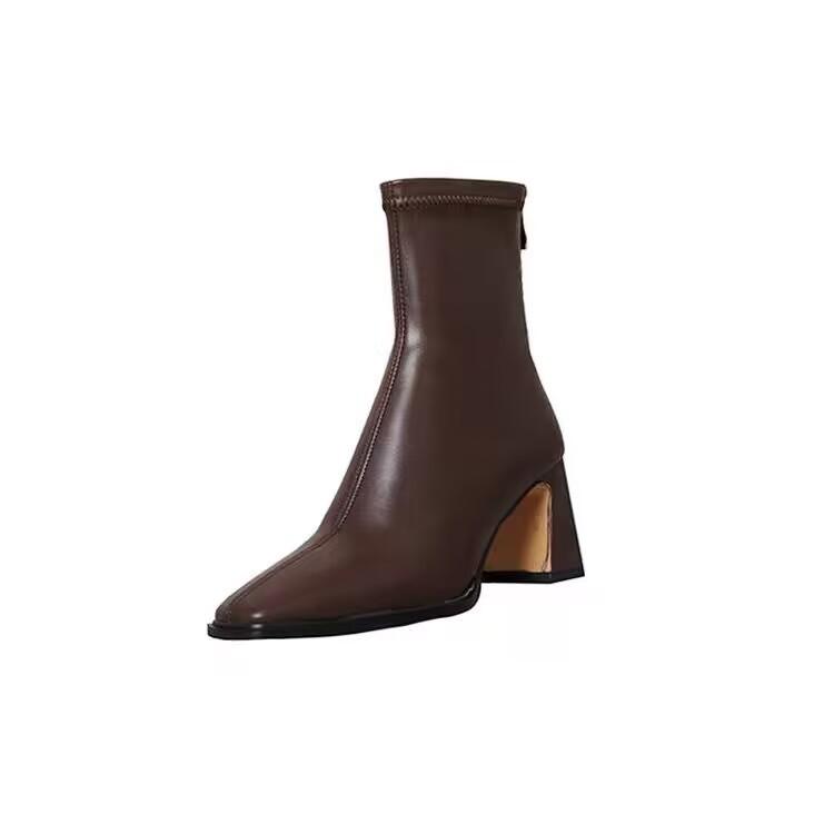 Весна и Осень Новые Ботильоны на Толстом Каблуке с Острым Носком Женские Коричневые Ботильоны Одинарные Ботинки Узкие Ботинки Задняя Молния Зимние Высокие Каблуки