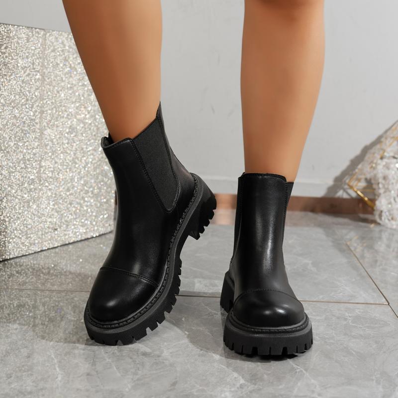 Повседневные однотонные черные женские ботинки челси из полиуретана 2025 Зима Круглый носок Толстая подошва Низкий каблук Ботильоны Мотоциклетные ботинки Женские